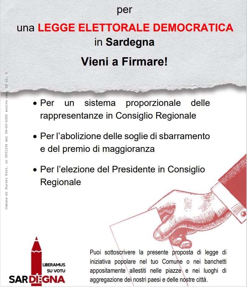 Si informa la cittadinanza che sono a disposizione i moduli per la raccolta firme per la Proposta di Legge Elettorale di SarDEGNA Iniziativa Popolare “Liberiamo il Voto”
