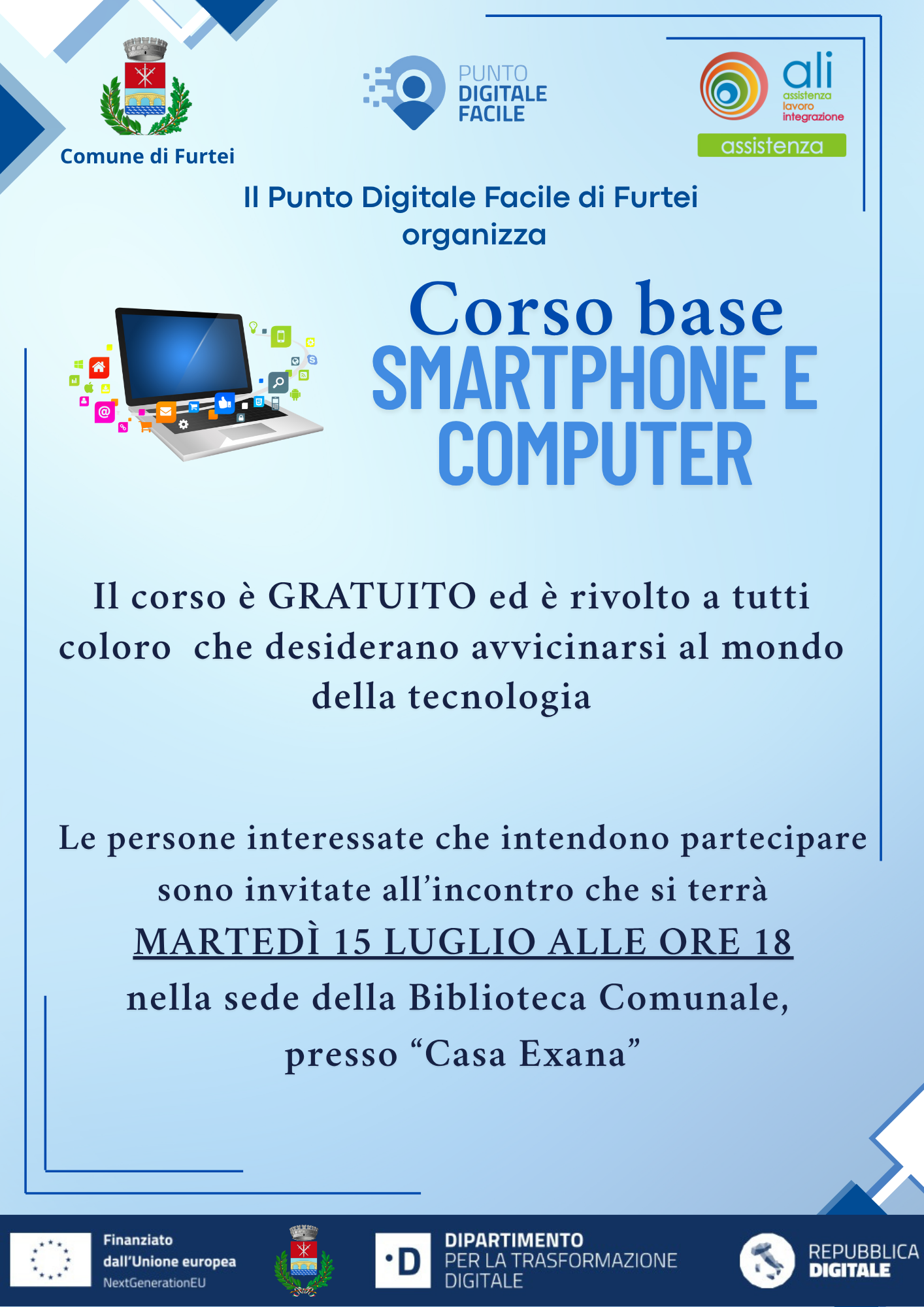 Si informa che il Servizio di Facilitazione Digitale del Comune di Furtei, martedì 15 luglio alle ore 18:00 nella sede della Biblioteca Comunale (“Casa Exana”), ha organizzato una riunione per introdurre un CORSO BASE GRATUITO di facilitazione digitale rivolto a tutti i cittadini che vogliano avvicinarsi al mondo tecnologico per facilitarne l'accesso e contrastare il digital divide.